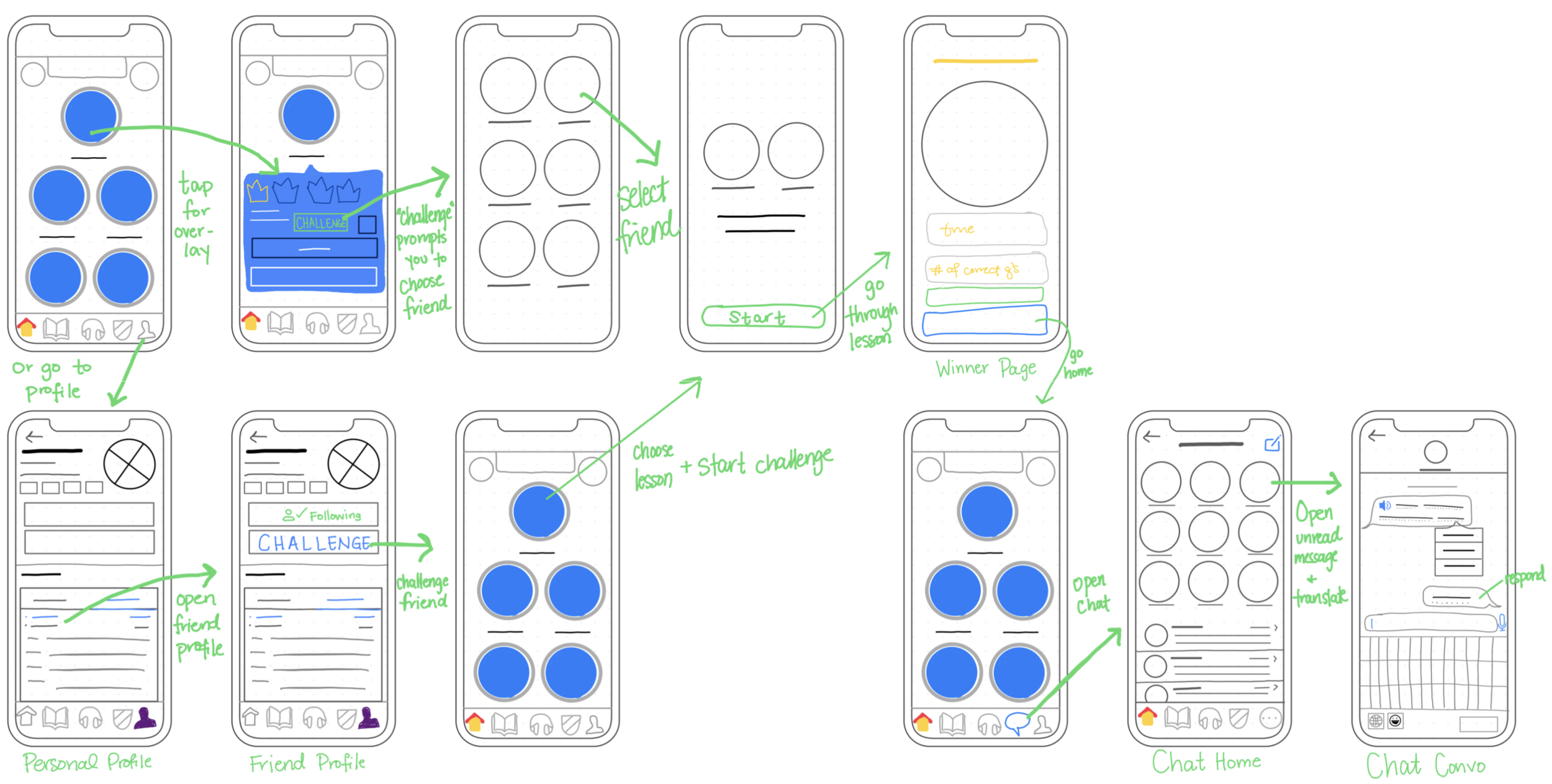 Building on our design studio concepts, I translated the selected features into detailed wireframes and end-to-end workflows, ensuring the new social features integrated seamlessly within Duolingo’s existing learning architecture. My focus was to introduce peer-to-peer interaction without disrupting the core study experience or increasing cognitive load.